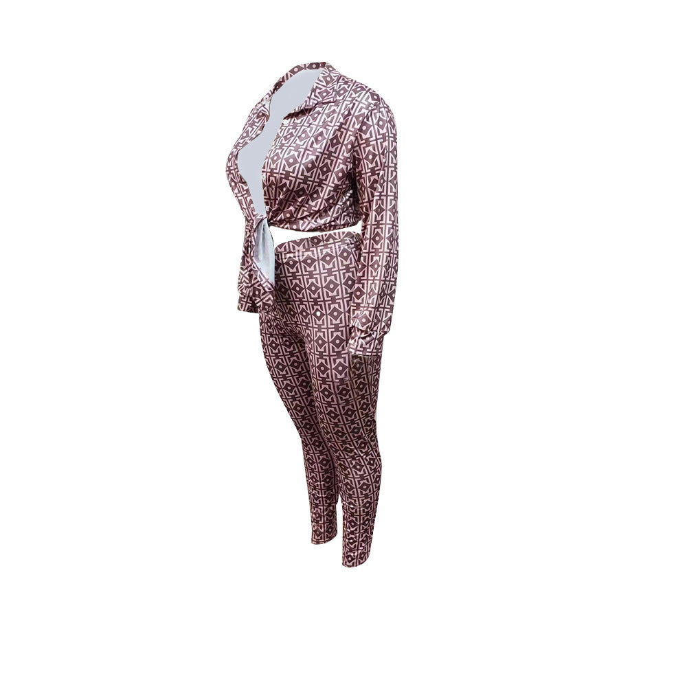 Plus Size Geo Pattern Shirt High Waist Pants Set